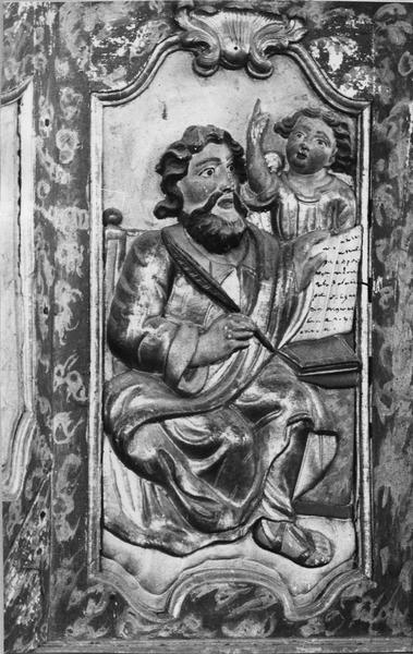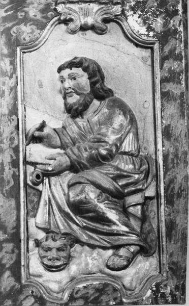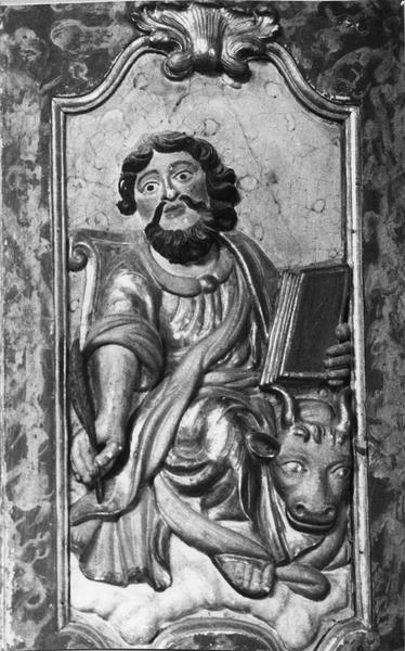 Les quatre panneaux sculptés de la cuve représentent les quatre évangélistes, chacun accompagné de son attribut.