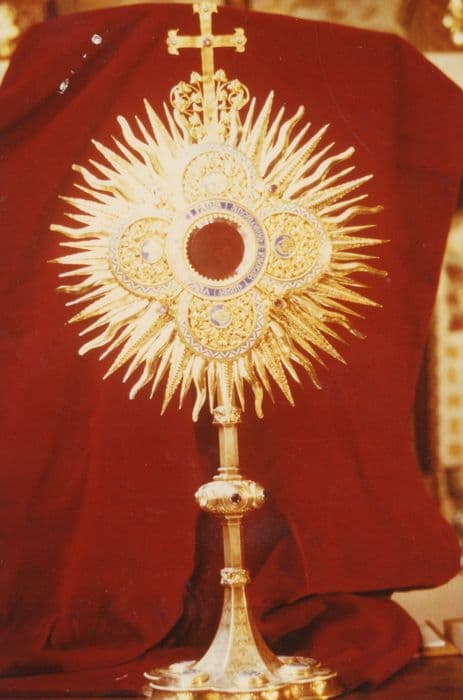 Incrustation de pierres précieuses et décor d'émaux. L'ostensoir est conservé dans un coffret.