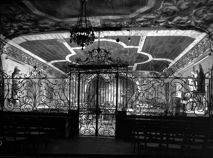 Plafond de bardeaux peints comprenant diverses scènes historiées : Jésus parmi les docteurs, l'Annonciation, le Jugement dernier, la Fuite en Egypte, la Visitation, le Frère Thomas Illyricus invoquant la vierge, tandis que la tempête gronde sur la mer.