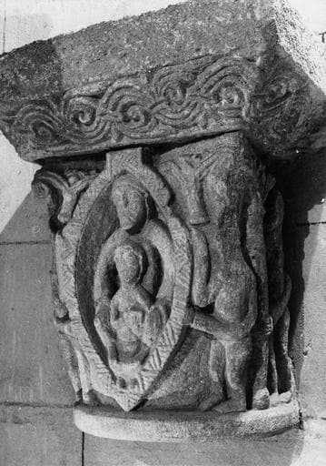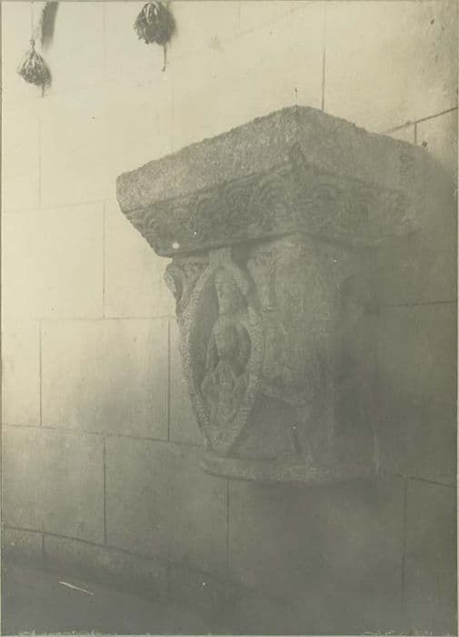 Ce chapiteau de colonne, encastré dans la muraille, sert de crédence. Sur la face antérieure, il y a une représentation de la Trinité.