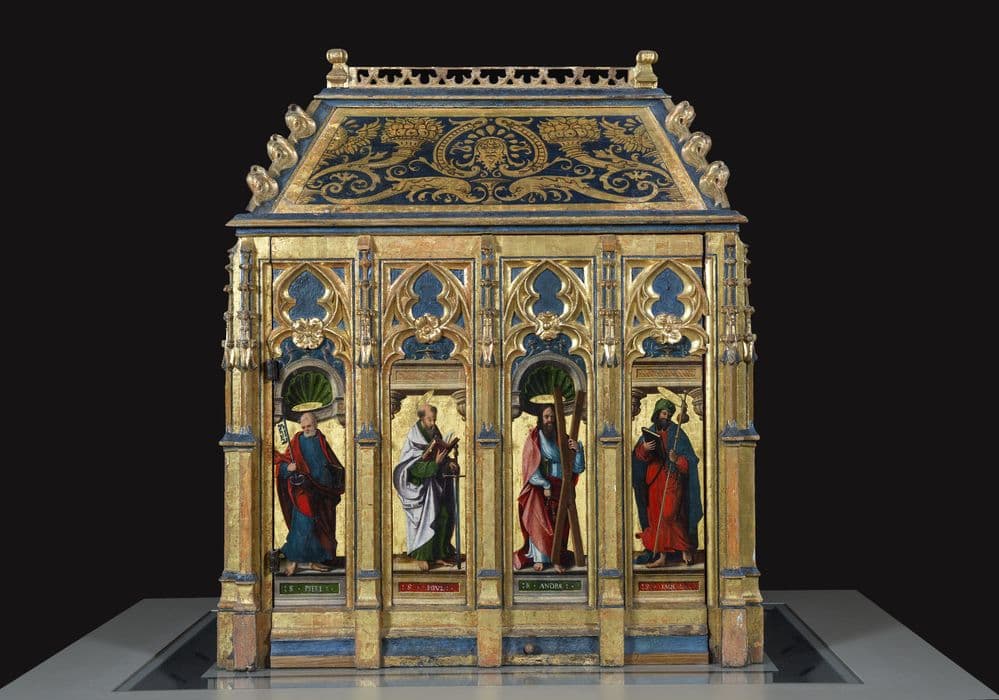 Cette châsse a la forme d'un coffre avec arcature et couvercle en forme de toit. Les arcs et les pilastres sont dorés. Le champ, outre cette architecture, est peint et représente des apôtres dont le nom est peint également.