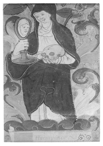 Bordure historiée, figurant Tempérance, l'une des vertus cardinales (avec Prudence, Force et Justice), portant pour éléments allégoriques un miroir ainsi qu'un crâne. Une inscription la nomme, « Attrempence ».