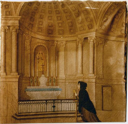 tableau ex-voto : dans une église une femme est agenouillée sur un prie-dieu