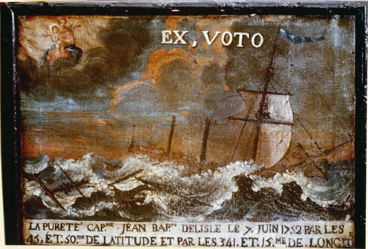 inscription : EX VOTO (en bas). inscription : La Pureté Capne Jean Bapte DELISLE le 7 juin 1752 par les 45 et 50è de latitude et par les 341 et 15me de longitude (en bas). Date : 1752.
