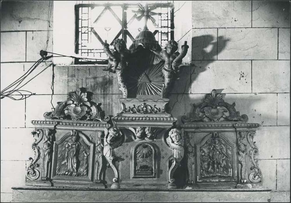 Tabernacle à ailes en bois sculpté, constitué de diverses essences : chêne ou châtaignier, bois blanc. L'exposition est constituée d'un socle, d'un panneau de fond et d'un dais. Apprêt gravé sur la face du tabernacle, le gradin et l'exposition. Décor en relief rapporté, sauf celui de la porte du tabernacle et du socle de l'exposition. Un mécanisme actionné par un bouton pressoir situé sur l'un des côtés du corps du tabernacle permet au fond du tabernacle de se déplacer ; de ce fait le ciboire tombe dans une niche située à l'intérieur de l'autel.