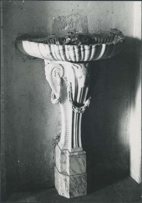 Cuve en forme de coquille ; bucrane sur l'avant du piédestal, à la jonction entre la cuve et le support.