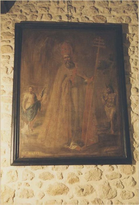 Saint Marcel est représenté en pied, au centre de la composition, revêtu de ses ornements pontifiaux, tiare sur la tête, croix à triple traverse dans la main gauche et esquissant un geste de bénédiction de la main droite. En retrait sur le sujet principal et à mi-hauteur, son représentés, à gauche : sainte Catherine d'Alexandrie couronnée, tenant l'épée et la palme du martyre avec la roue de son supplice et, à droite : saint Sébastien attaché à l'arbre de son supplice. Les trois sujets reposent sur une terrasse et se détachent sur un fond paysager, actuellement recouvert d'un "jus" sombre.