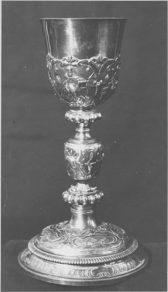Quatre sujets dans des médaillons rocaille représentant les attributs de la Passion - Noeud décoré d'angelots, forme balustres entre deux cercles à bordures de perles pendantes - coupe large, évasée, décorée d'encadrements fleurdelysés, de quatre sujets représentant les Pères de l'Eglise.
