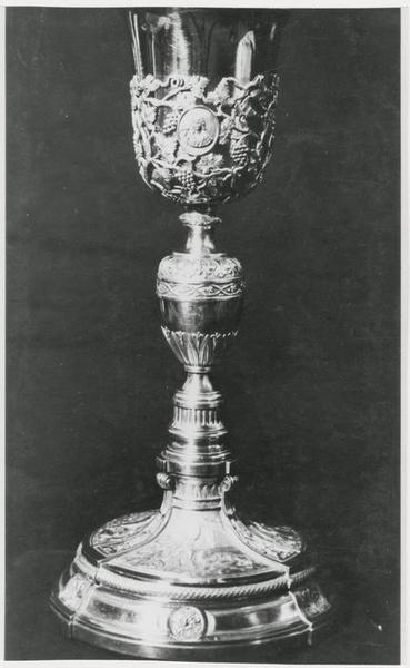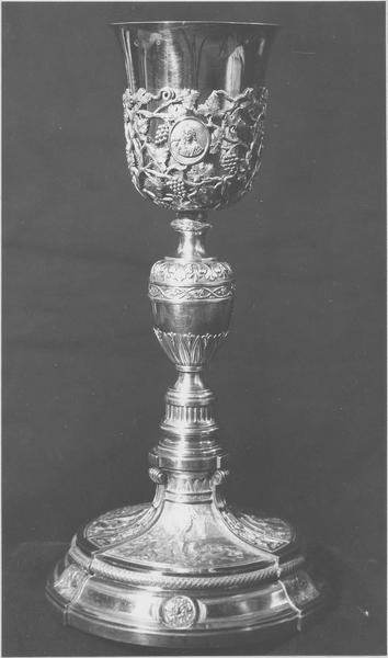 Forme balustre. Coupe profonde, légèrement évasée. Pied rond divisé en trois compartiments représentant trois sujets bibliques : le serpent d'airain, la traversée du Jourdain, le sacrifice d'Abraham. Coupe décorée de grappes et feuilles de vigne ciselée en applications, enveloppant trois médaillons représentant en buste : Jésus, Marie et saint Jean.