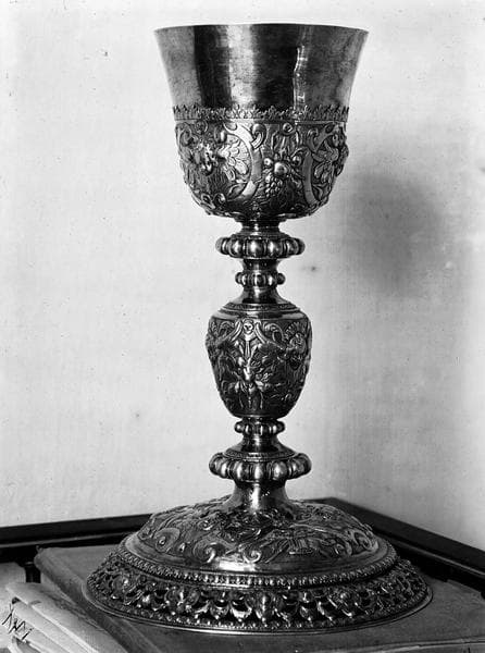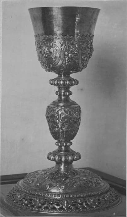 Du pied rond, à bordure ajourée, s'élève le fût, arrêté haut et bas et au-dessous du noeud par une corniche à grosses perles.