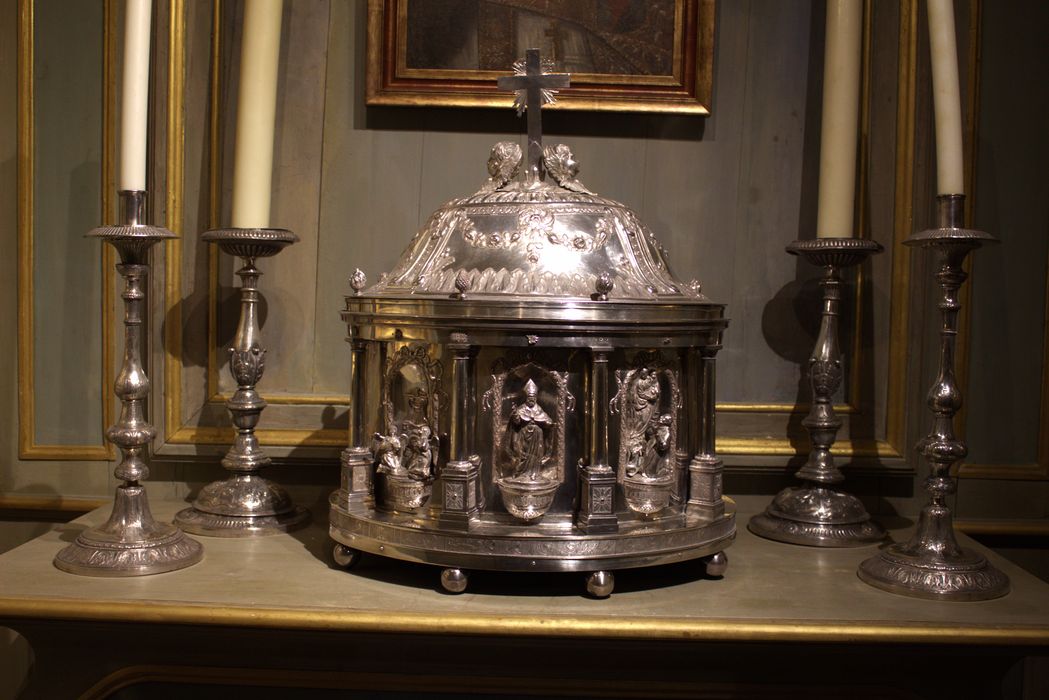 Reliquaire en forme de dôme dont la calotte est surmontée d'une croix.