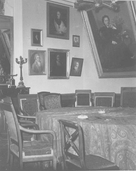 mobilier de la salle des commissions : 2 armoires, secrétaire, table (console), 14 fauteuils dont une bergère, chaise, tabourets (2)