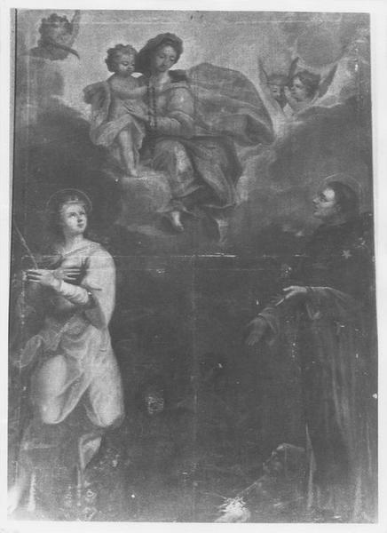 tableau : la Vierge et l'Enfant présentant le Rosaire à saint Dominique, en présence d'une sainte martyre