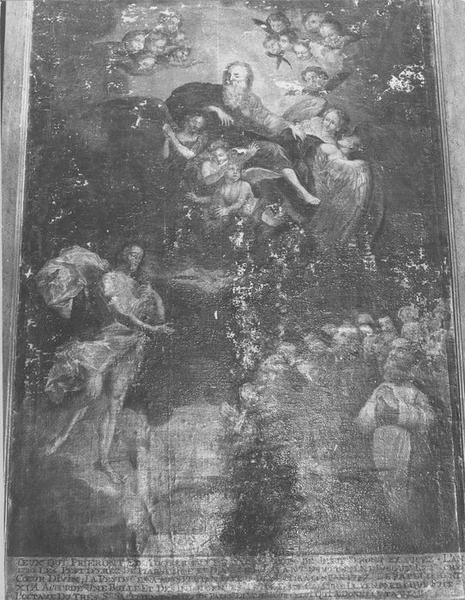 Inscription votive (au bas du tableau) : Ceux qui prieront et adoreront le Sacré-Coeur de Jésus seront exaucez. L'an 1720 les pestiferez de Marseille et d'Arles (?) ayant dévotement invoqué le Sacré-Coeur divin, la peste cessa aussitôt. En faveur de ce miracle l'an 1727 le pape Clément XI a accordé une bulle et des indulgences. Cette peste se célèbre le vendredi qui suit l'octave du T.S.Sacrement. Dites un pater et ave pour celui qui a donné ce tableau.
