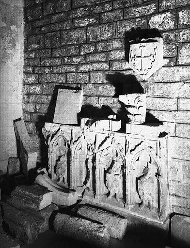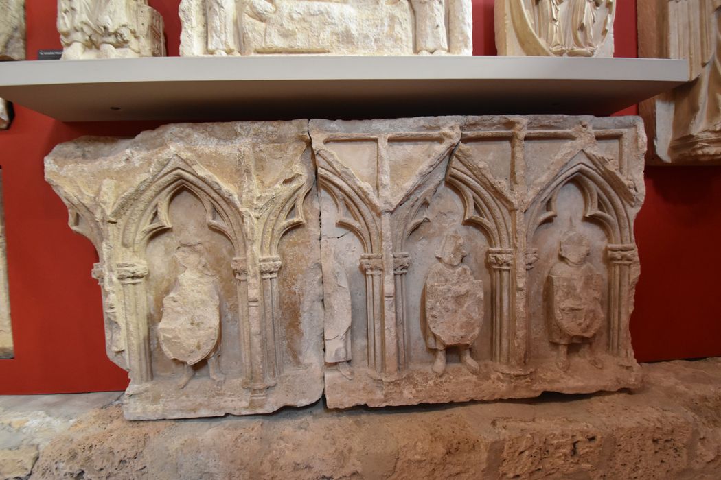 Un soubassement de tombeau avec personnages en haut relief portant des écussons dans des niches trilobées.