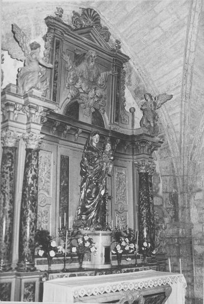 Autel en marbre polychrome Louis XV, retable en bois peint et 4 colonnes en marbre rouge.
