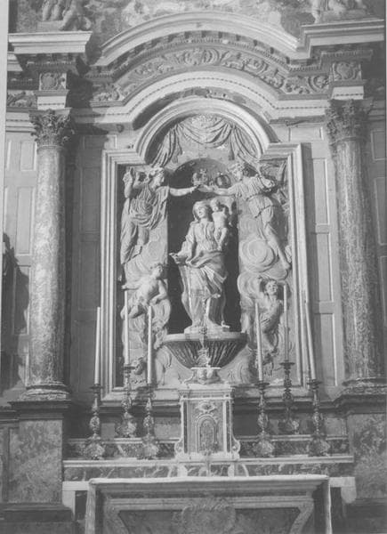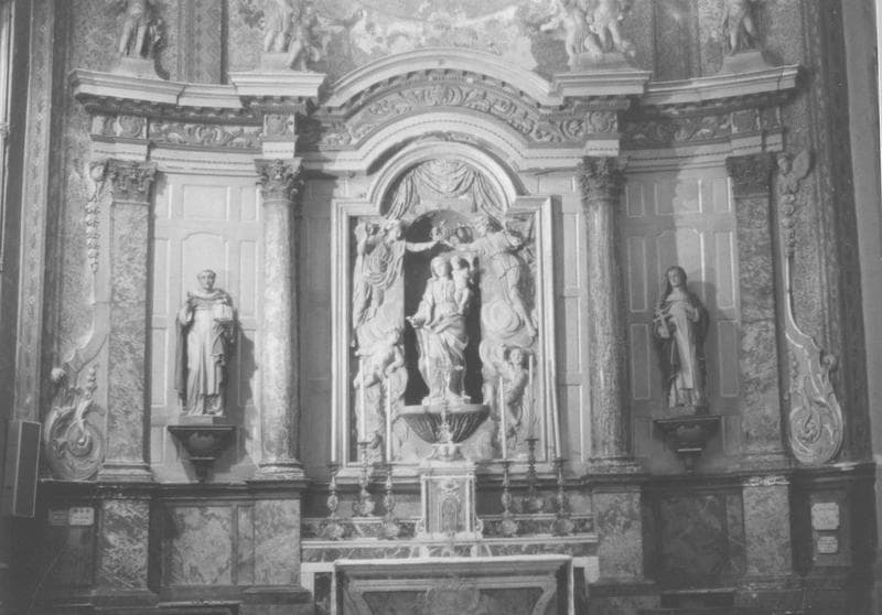 Autel de marbres polychromes, panneau de stuc avec la statue de la Vierge en marbre datés de 1758 et 1772.