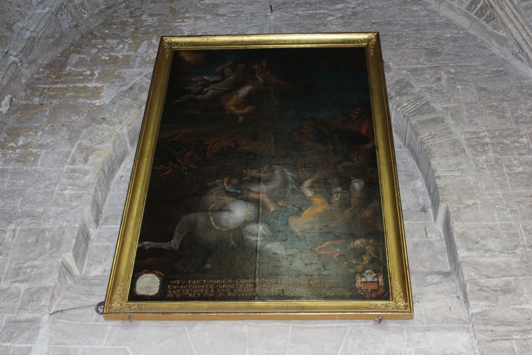 Inscription en bas de la toile, avec armoiries : VOEU FAIT PAR LA COMMUNAUTE DE CLERMONT/EN ACTION DE GRACES DU RECOUVREMENT DE LA/SANTE APRES UNE GRANDE PESTE. EST AS CONSULS/M.R. REY CAL (?) P. POUSSINE ET R. (mot intercalé) St PAUL EN L'AN 1653.