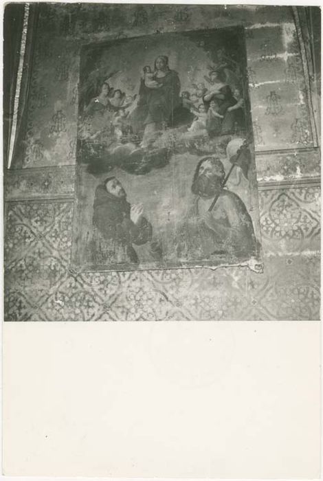 La Vierge à l'Enfant est figurée dans le registre supérieur, dans des nuées, entourée d'un choeur d'anges. Au registre inférieur, saint Jean-Baptiste et saint François, en buste, lèvent les yeux vers elle en signe de dévotion.