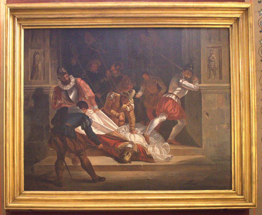 Louis-Joseph Fanelli-Semah (1804-1875) est un élève de Gros. La composition relate le moment où le corps du saint évêque est trainé par les protestants en 1573, selon une des deux vignettes du bréviaire de Monseigneur de Fumel (1774) : scène du corps du saint évêque trainé par les protestant et odieusement profané en 1573.