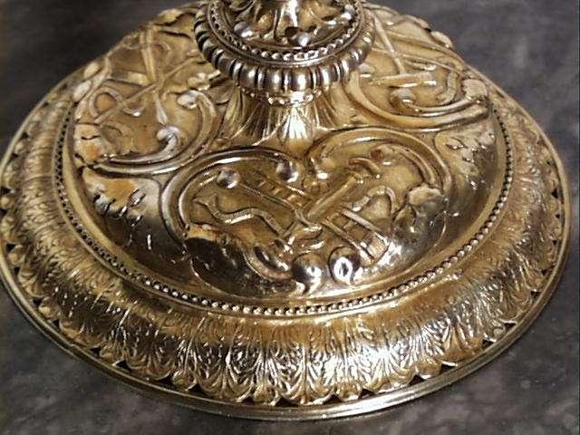 Poinçons sous le pied. Poinçon de maître : B encadré de 2 points de remède/ LA/ C couronné ; poinçon de communauté TO surmonté d'une fleur de Lys, un B au-dessous ; poinçon de décharge : globe terrestre surmonté d'une croix ; M couronné avec au-dessous une fleur de lys ou un trèfle ; un cheval ou un âne ; sur le pied : une croix du Languedoc couronnée.