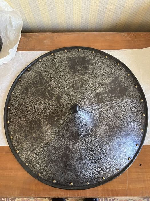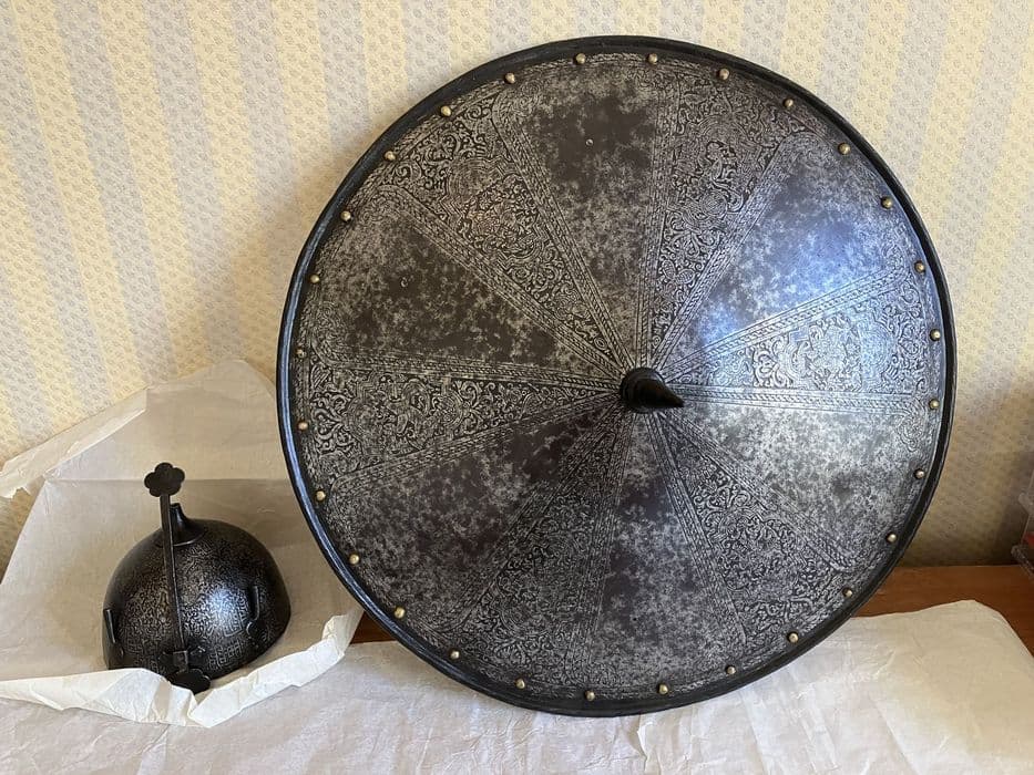 Bouclier de type rondache en fer forgé, orné de motifs de style renaissance avec six bandes portant deux putti et quatre chevaliers dans des cartouches entourés de chutes d'ornements et cuirasses ; casque d'enfant de type indo-persan en fer forgé avec des inscriptions et médaillons figurant des soldats à cheval, ayant perdu toutefois sa pointe et son filet en mailles d'acier ; porte-sabres ou râtelier en bois, fer et velours, pour ranger des armes d'entraînement type fleurets).