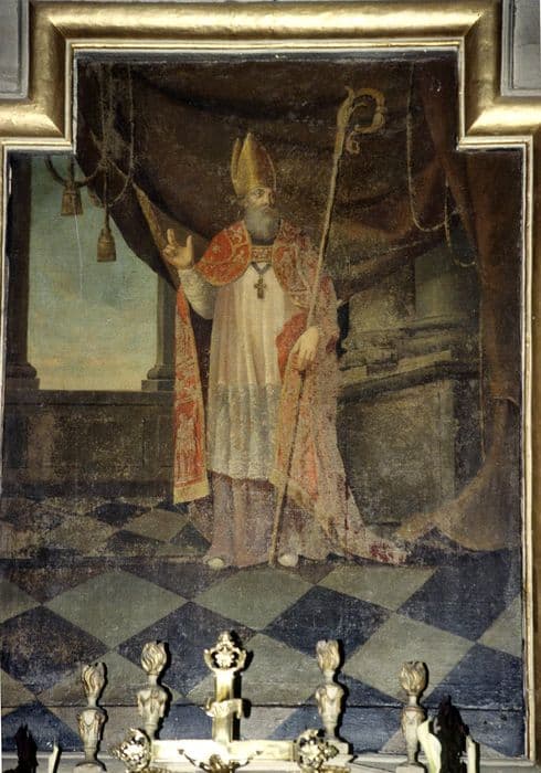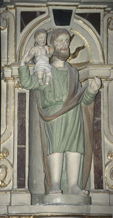 Le tableau central est surmonté d'une inscription, et d'une niche à colonnettes d'où s'échappent des cornes d'abondance. Quatre colonnes de marbre ornent le retable. Des statues sont placées dans les deux niches latérales.