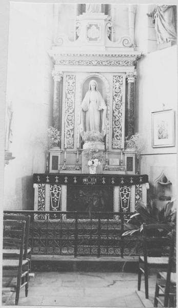 Retable composé d'une niche entre deux panneaux décorés d'entrelacs dorés et de deux colonnes. Le retable présente une peinture du Couronnement de la Vierge.