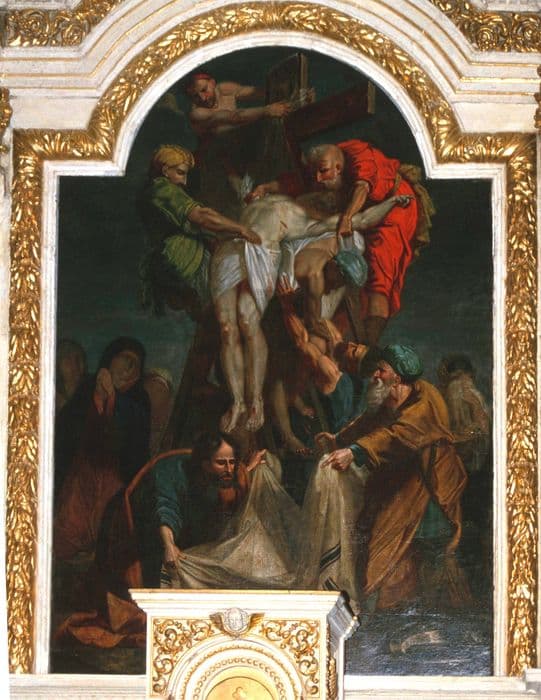 Retable comportant cinq statues anciennes. Au centre, tableau contemporain du retable.
