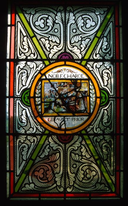 Petit vitrail à motif profane. Les verres incolores présentent une teinte verdâtre naturelle caractéristique de cette période, due à la présence d'oxydes de fer parasites dans les éléments qui ont servi à composer le verre.