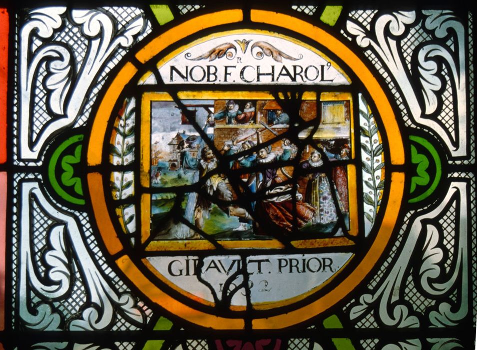 Exemple encore assez rare dans la région, d'un vitrail civil, provenant probablement d'une demeure privée et remonté en bouche-trou dans une verrière de l'église paroissiale où il est mentionné en 1927.
