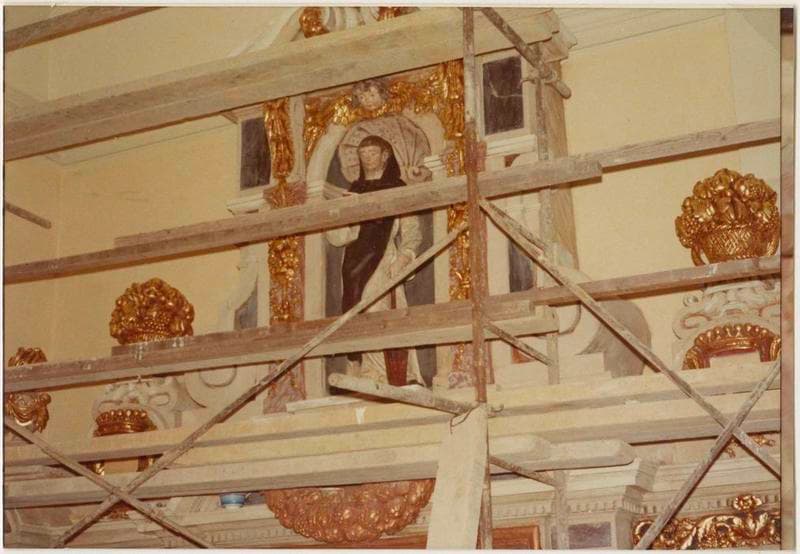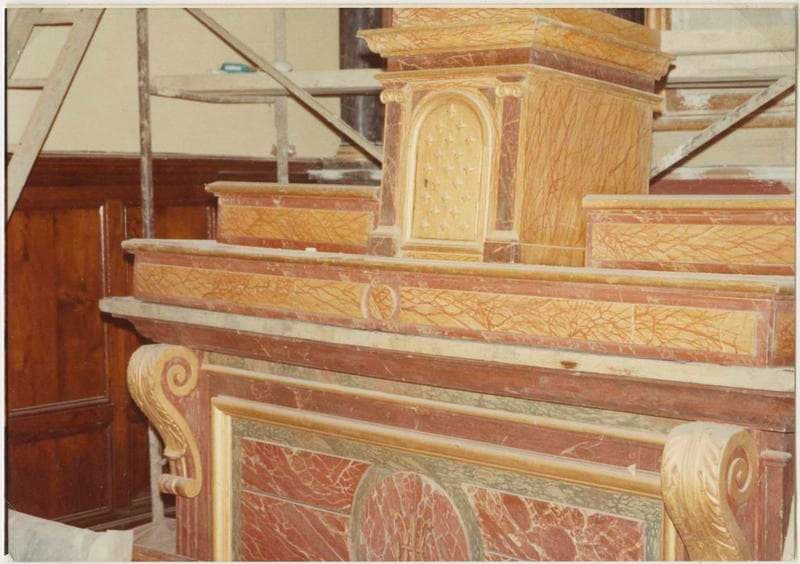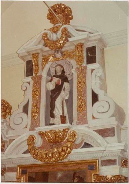 Au centre, un tableau encadré de grosses moulures. A droite et à gauche, des niches amorties en coquilles et encadrées à leur partie supérieure par les ailes qui entourent une tête de chérubin. Deux pilastres cannelés (un de chaque côté du tableau) et quatre colonnes (une de chaque côté de chacune des niches) surmontés de chapiteaux corinthiens, supportent un entablement. Au-dessus du tableau central, un fronton courbe orné d'une guirlande, et surmonté d'une niche.