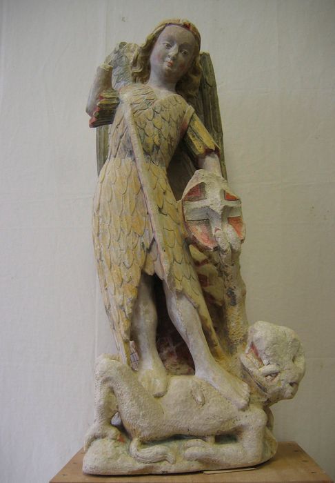 Le saint est debout sur un dragon. En appuis sur sa jambe droite, son corps déhanché forme une courbe. Il tenait dans sa main droite levée (main disparue) une lance qui est aujourd'hui en partie cassée transperce le ventre du dragon situé à ses pieds. Il porte dans sa main gauche un bouclier avec un écusson en forme de croix. le dragon lève sa patte droite en repoussant le bouclier. Saint Michel est vêtu d'une tunique en plumes qui le recouvre entièrement. Deux grandes ailes confirment sa qualité d'archange. Derrière le saint, il semble y avoir une montagne représentée par un amas de petits cubes. Saint Michel a les traits fins avec des yeux étirés en longueur. Les paupières inférieures et supérieures sont légèrement incurvées. Le globe est peu saillant. Sa bouche affiche un léger sourire. Le sillon médian de la lèvre supérieure est bien marqué. Le menton est arrondi. Sa chevelure ondulée est maintenue par un bandeau serti d'une pierre carrée.