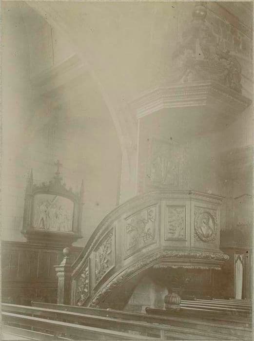 Chaire comprenant un escalier à quartie tournant avec trois panneaux décorés de feuillages. La cuve comporte quatre panneaux, deux grands et deux petits décorés de feuillage sauf un représentant un buste de femme dans un médaillon. Au-dessous, un amortissement en feuillage. Abat-voix composé de six consoles supportant une boule sevant de piédestal à l'ange du Jugement.