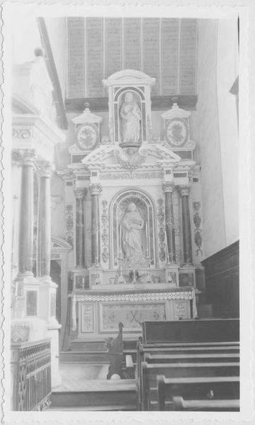 Retables en pierre blanche et marbre noir. Le maître-autel et son contre-retable sont en bois sculpté. Le contre-retable en bois doré est orné de miroirs et de quatre statuettes. Le milieu du grand retable est occupé par un tableau. Les niches latérales abritent des statues. Le retable latéral sud comprend deux niches superposées comprenant des statues. Les retables sont ornés de colonnes, angelots, guirlandes de fruits, cornes d'abondance.