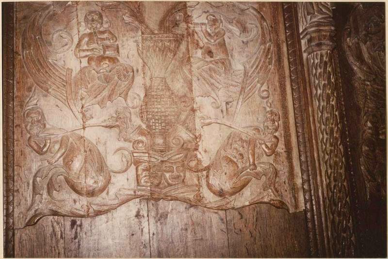Stalles (?). Sièges avec miséricordes à têtes sculptées. Accoudoirs sur colonnettes ornées. Hauts dossiers avec très fines arabesques dans la partie supérieure, séparés par des colonnettes ornées. Voussure en bois, corniche et baldaquin sculptés.