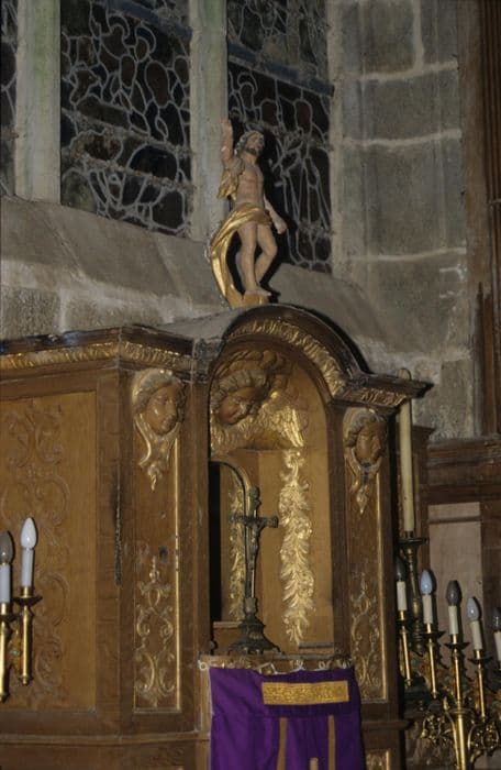 La contre-table comporte un miroir et une statuette. Deux hautes ailes en quart de cercle laissent la baie centrale dégagée, disposition assez fréquente au 18e siècle dans l'ancien diocèse de Saint-Malô.