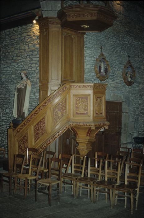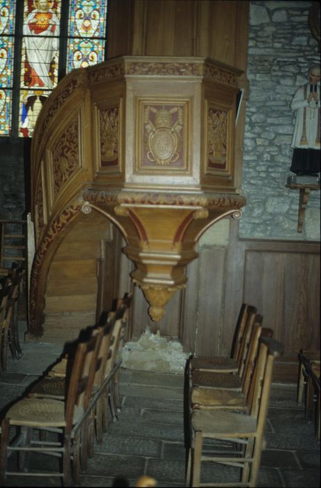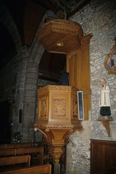 La caisse est hexagonale. Le panneau central est orné du blason d'un pape. Les autres panneaux sont ornés de corbeilles de fleurs. La rampe est composée de trois panneaux décorés d'entrelacs. Elle est bordée, comme la caisse, de deux frises sculptées. Le cul-de-lampe est orné d'un gland et de feuilles d'acantes. L'abat-voix est en forme de baldaquin.