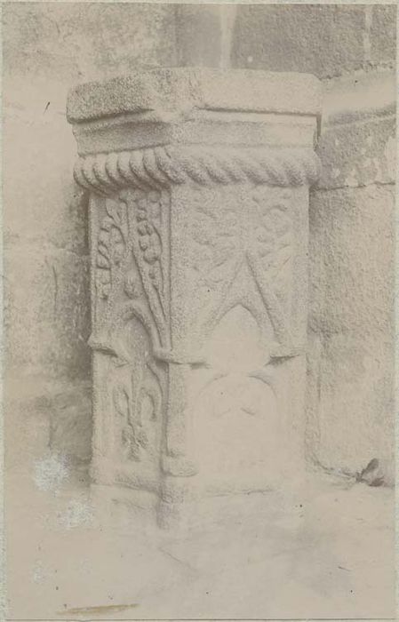 De forme hexagonale, il est décoré sur trois faces, d'arcades trilobées renfermant des hermines et des fleurs de lys. Il est également décoré de feuillages et couronné d'une torsade.