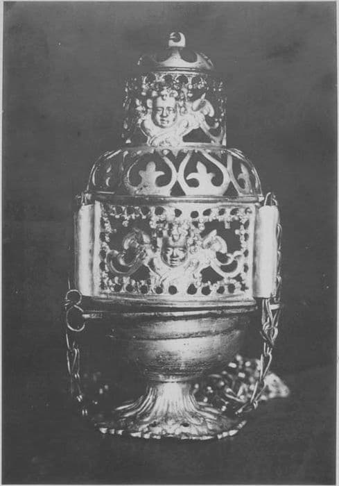 L'oeuvre est composées d'un pied, d'une cassolette et d'un couvercle. Pied décoré de godrons terminés par une bordure de feuilles d'acanthe. Cassolette en forme de calotte unie décorée d'une moulure à trois oreilles pour les chaînes et d'un double filet tourné dans la partie inférieure. Couvercle de forme cylindrique terminé par un petit dôme à lanterne. Décoration en trois panneaux très ajourés.
