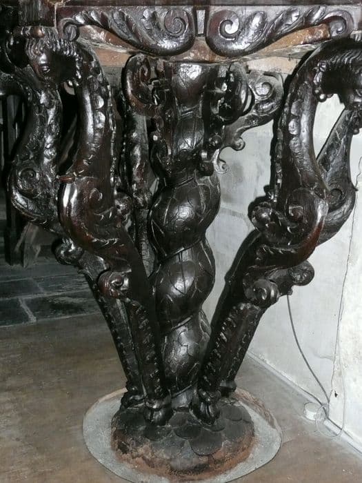 Cuve comportant cinq panneaux sculptés, supportée par une colonne torse avec feuillage, terminée par des consoles. Cinq grandes consoles avec pieds de griffons, têtes et feuilles d'acanthe, partent du pied de la colonne pour soutenir la cuve.
