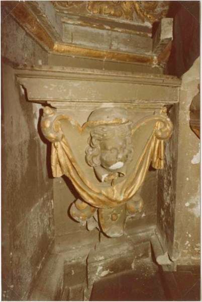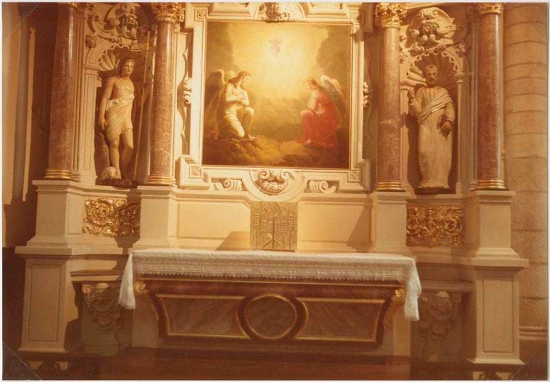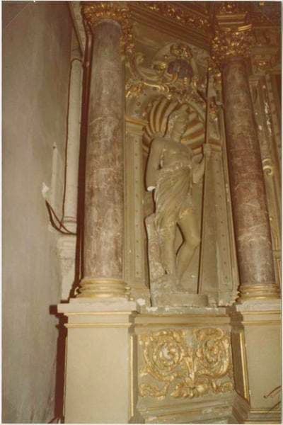 Retable constitué d'un soubassement supportant quatre colonnes corinthiennes qui encadrent deux niches avec sculptures et un tableau dans un cadre en pierre. Entablement avec frise sculptée. Au-dessus de la partie centrale, une niche entre des colonnes de marbre et des cariatides. Corniche cintrée.