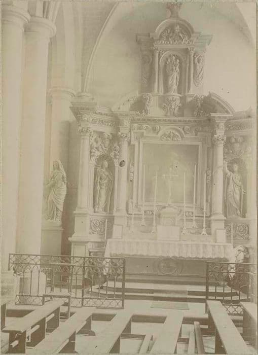 Retable constitué d'un soubassement supportant quatre colonnes corinthiennes qui encadrent deux niches avec sculptures et un tableau dans un cadre en pierre. Entablement avec frise sculptée. Au-dessus de la partie centrale, une niche entre des colonnes de marbre et des cariatides. Corniche cintrée.