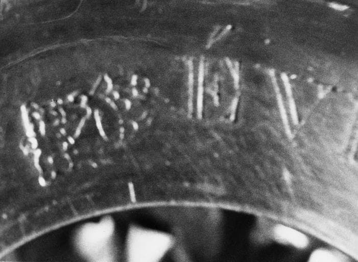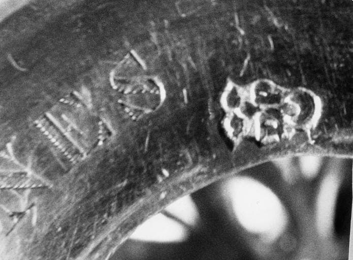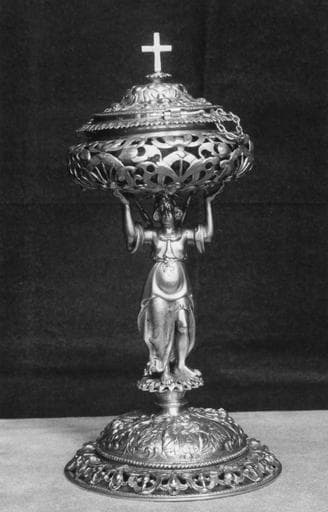 Pyxide en forme de petit ciboire. Pied arrondi terminé par une frise ajourée. Deux scènes le décorent.