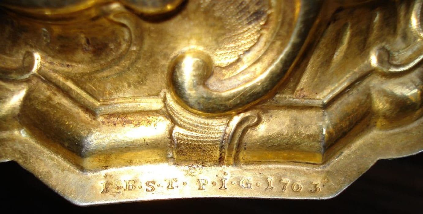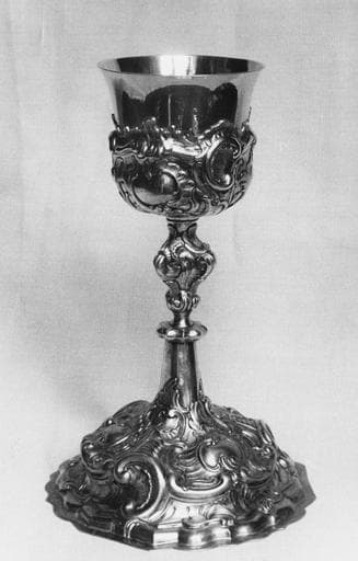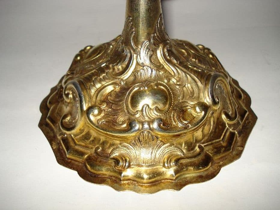 Décor de cartouches rocaille sur le pied, le noeud et la coupe.