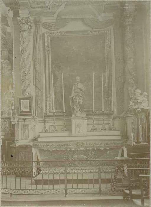 Au-dessus d'un soubassement, deux colonnes torses d'ordre corinthien supportent un entablement à corniche cintrée encadrant un motif de draperie qui sert d'entourage au tableau.