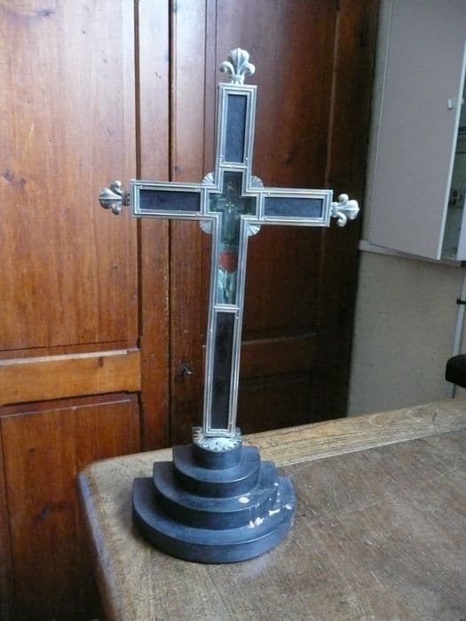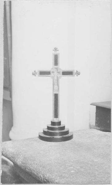 Reliquaire de la parcelle de la Vraie Croix rapportée par Pierre Croc en 1761. Les bras de la croix sont terminés par des fleurs de lys. La croix est placée sur un socle comprenant quatre gradins circulaires.