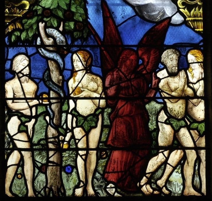 4 verrières : Paradis terrestre : la Faute et le châtiment, le Massacre des Innocents, le Baptême du Chris, Jésus à Bethléem