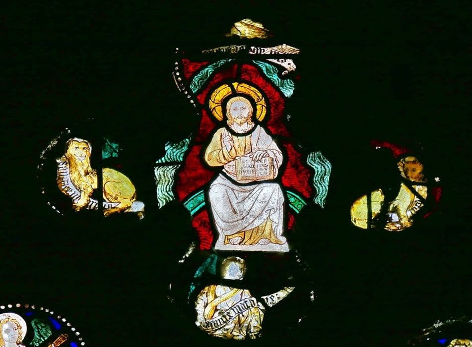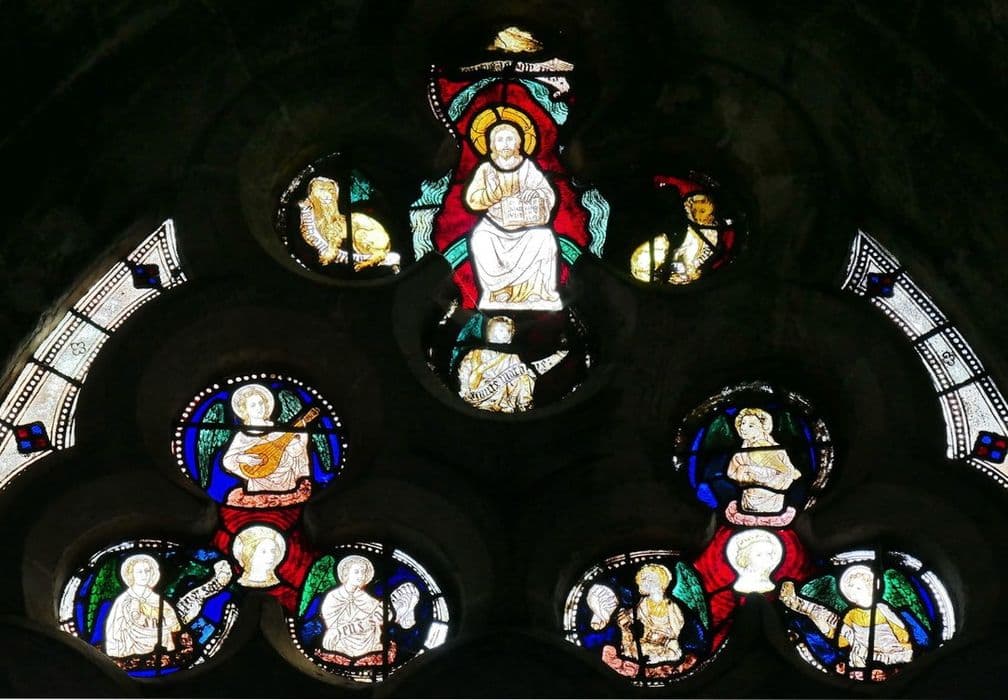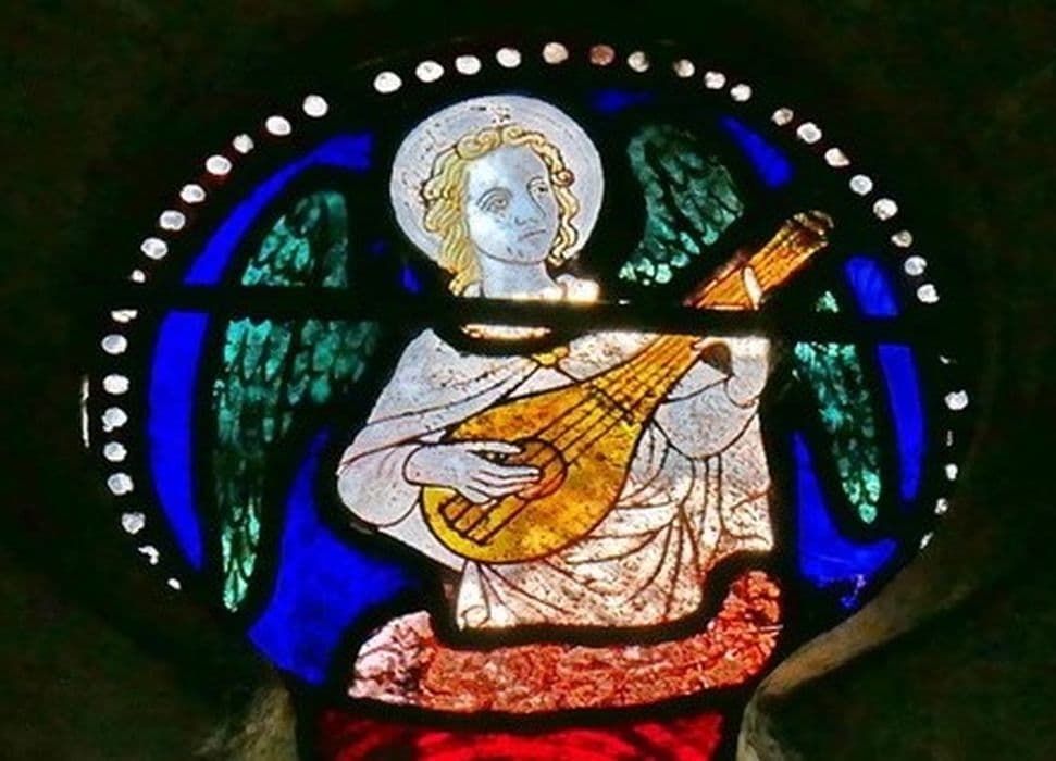 verrière : Christ bénissant (le), ange jouant d'un instrument de musique