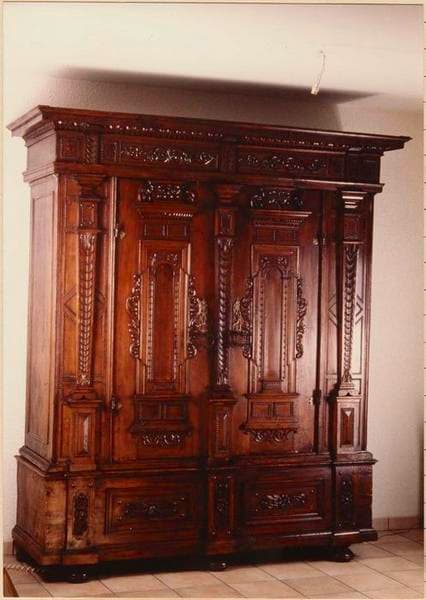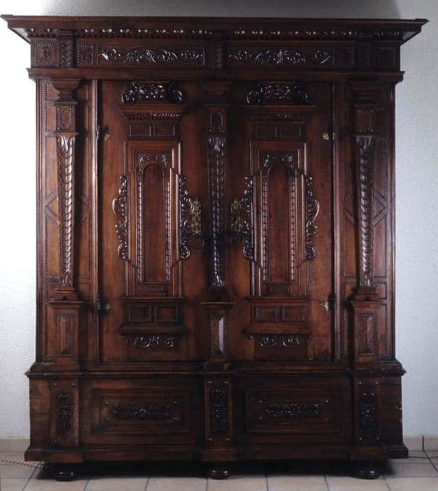 Armoire à deux portes et base formant coffre à deux faux tiroirs.